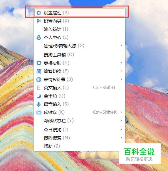 首先,对着电脑桌面上的搜狗输入法状态栏击右键,选择“设置属性”菜单。