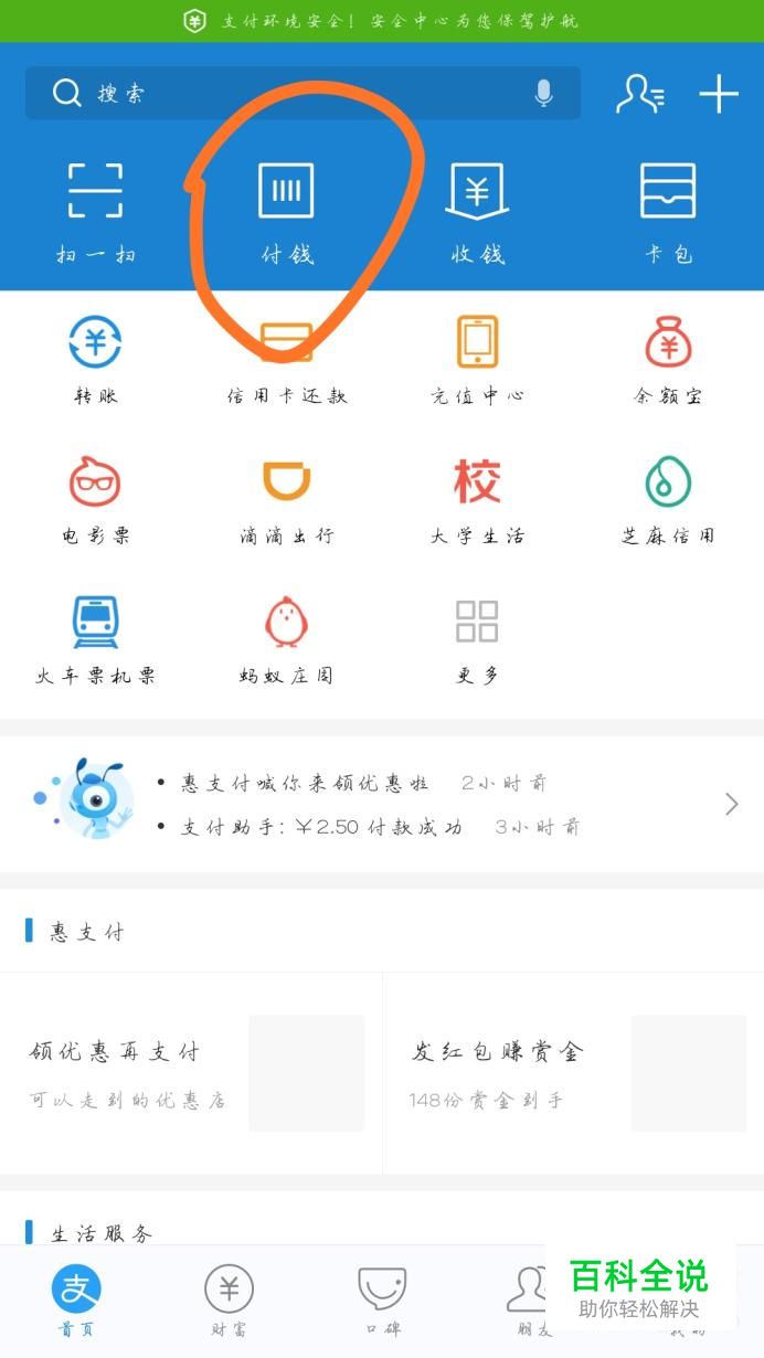 打开你手机支付宝上的“付款”,就会出现一个付款码,你可以通过别人扫描你的付款码,你可以完成付款,如下图所示