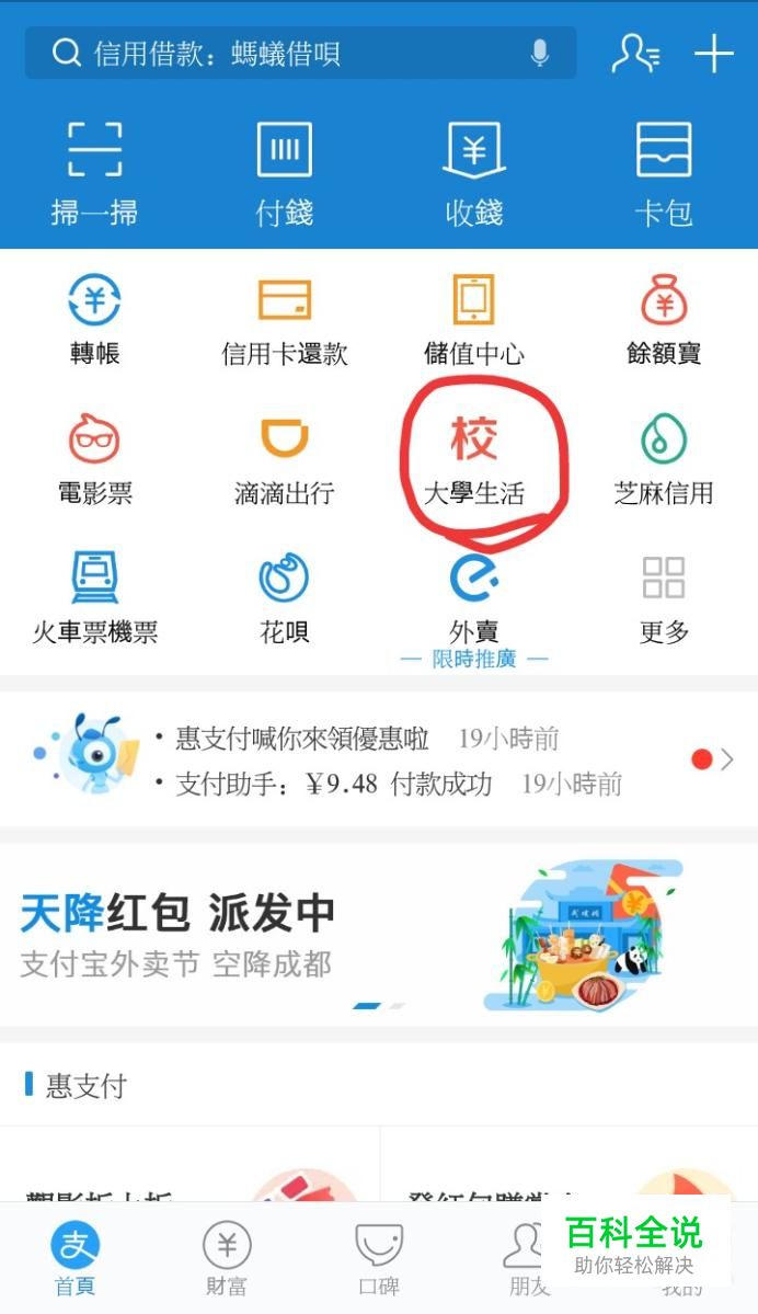 首先打开支付宝,点击屏幕上的“大学生活”