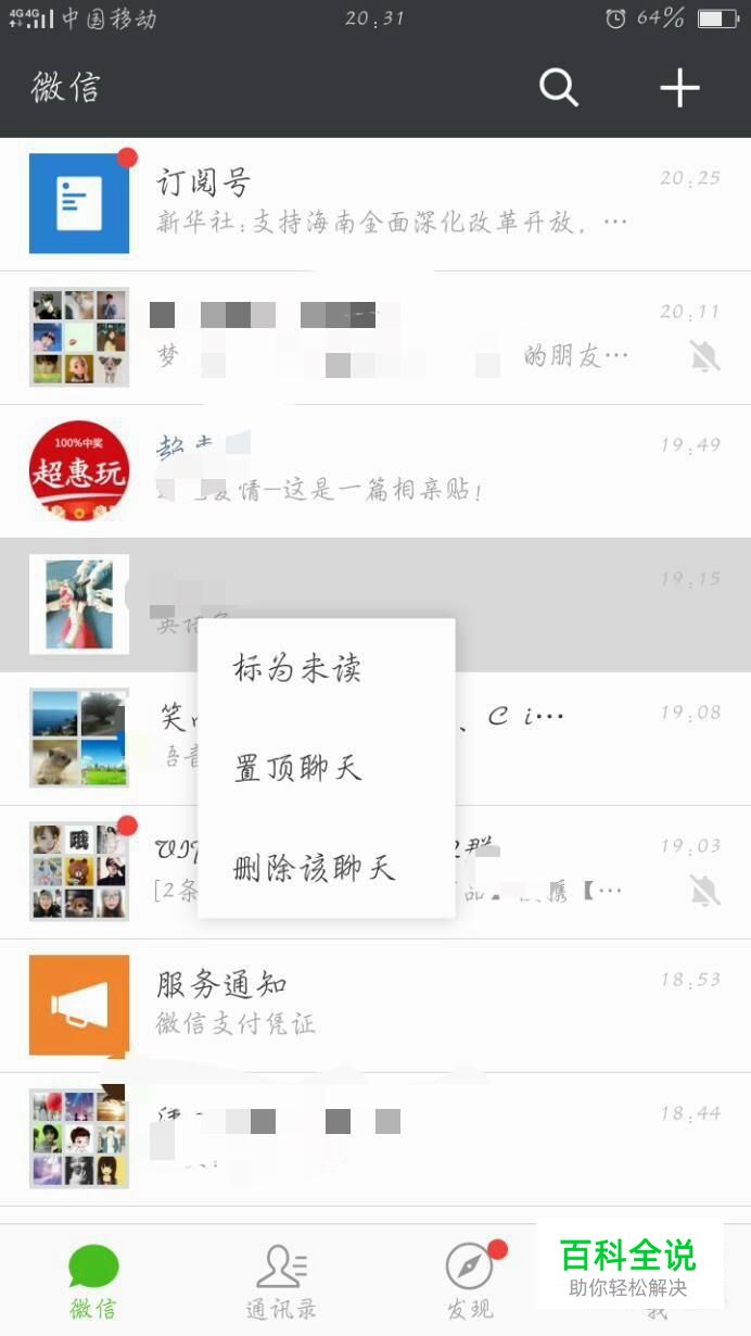 按住几秒钟后,会出现一个对话框,从上到下依次是标为未读、置顶聊天、删除聊天,选择第一个标为未读就可以把消息设为未读了。