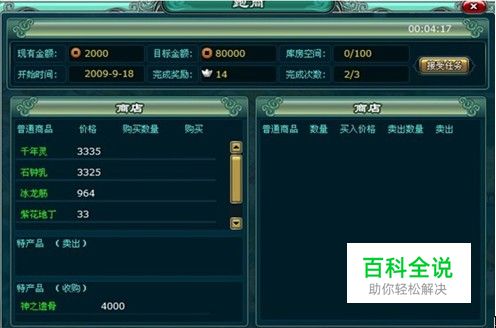 跑商任务的简单介绍: 跟大家简单介绍一下,跑商是一个不可缺少赚银两的路径.当你的人物角色等级为20了,就可以参加这个赚银两的机会.如下图所示: 现有金额:指的是你接受了跑商任务的旅程,所赠送的初始金额. 目标金额:指的是当你从现有的金额,不断地增加,增加到了目标金额,就算完成了第一次跑商任务.(不同等级有不同的次数哦,当然我是40级来的) 库房空间:是指你购买商品的数量限制. 开始时间:是指你接受任务的时间., 完成奖励:每当你完成了一次就有相应的报酬,如:银两14(注意哦,不同的角色等级获得的银两会递增的,加油哦) 完成次数::不同等级有不同的次数哦,当然我是40级来的,所以比较多, 当完成次数已经满了,那当天的跑商任务就已经完成了 (每五分钟都会对商品刷新一次)