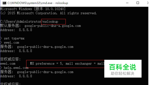 检查MX记录是否正确 得到结果为MX preference = 5或者MX preference = 5