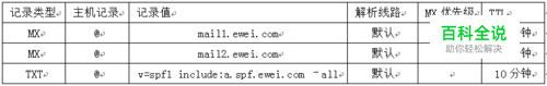 SPF记录设置 SPF是通过域名的TXT记录来进行设置的。 为了提升域名邮箱发送外域(扣扣以外的邮箱)邮件的成功率,建议您给自己的域名设置一条TXT记录来避免这种情况。 TXT记录值为:v=spf1 include:a.spf.ewei.com–all