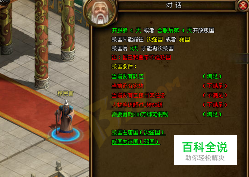 在魅影传说游戏中,玩家若不想再在本国发展下去,是可以更换国家的。但为了避免一家独大,强国玩家可叛国去次强国和弱国,次强国玩家只能叛国去弱国,弱国玩家只能叛国去次强国。 那么魅影传说怎么叛国呢?找哪个NPC呢?在游戏开服的第4天和合服当天开服叛国系统,玩家可在王城找到NPC移民官(87,84)叛国。叛国只能叛去次强国或弱国,而叛国后3天才能再次叛国,其中国王和皇帝不准叛国。玩家叛国还必须满足以下条件: