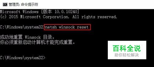 2、在打开的命令提示符窗口中,输入命令“ netsh winsock reset”,如下图所示: