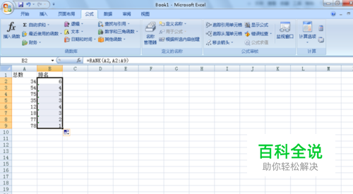 这时在B2单元格就显示了A2数据的排名。这时我们将光标放在B2单元格右下角,当光标变为“+”号时拖动光标到B9单元格。这样,在B列单元格中就显示了A列单元格数据的排名。