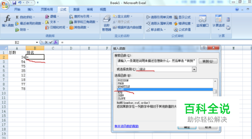 打开“插入函数”对话框,在“或选择类别”右侧的下拉列表框选择“统计”,在“选择函数”中选择“RANK”,点击“确定”。