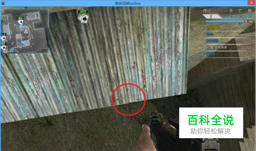 然后把鼠标下拉使枪械的准星处于板子(挡雨棚)的边缘处。这时按一下键盘的空格键(即使命召唤OL中的跳键)