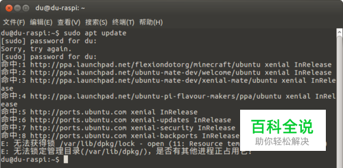 假设用户更新系统,更新到一半突然断电死机,那么这个锁没有解除,下次无法直接安装软件,会出现如图所示的提示,不过我们可以手动解除这个锁。