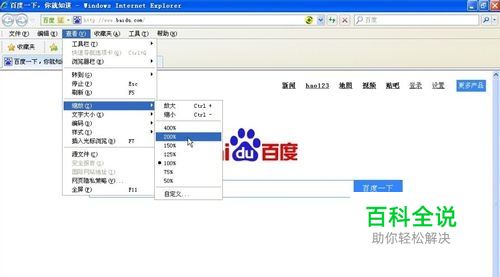 打开ie浏览器,点击工具栏上的查看,弹出下拉菜单,将鼠标指针移到缩放,再选择缩放的比例。