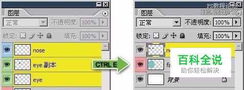 如下图所示,原先位于下方的“face”层由于和原先位于最上方的“nose”层合并,合并后的图层还是位于最顶层,使得两个眼睛都被其遮挡了。由于合并图层会造成图层层次的改变,因此合并后需要注意图层的层次是否正确。