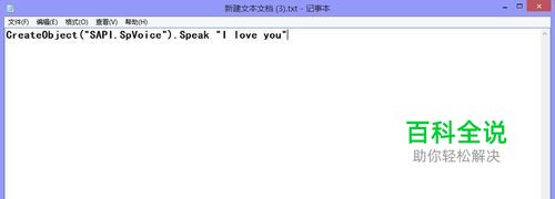 打开记事本将这段代码粘贴进去 CreateObject("SAPI.SpVoice").Speak "I love you"