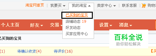 登录淘宝网站,点“我的淘宝”下拉菜单里的“已买到宝贝”。