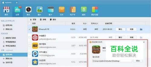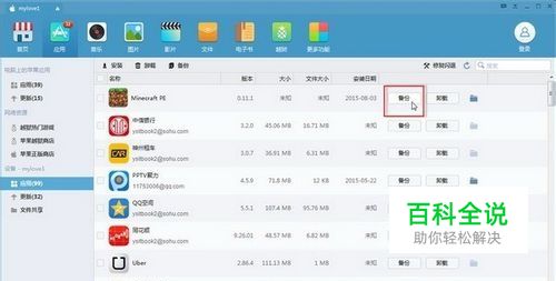 在电脑上打开 同步助手,并连接设备。待助手识别设备后,切换到“应用”界面。在设备烂,选择“应用”,即可找到需要备份存档的游戏或应用,单击其右方的“备份”按钮。