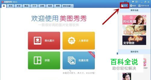 打开美图秀秀后单击右上方的“打开”选择图片。