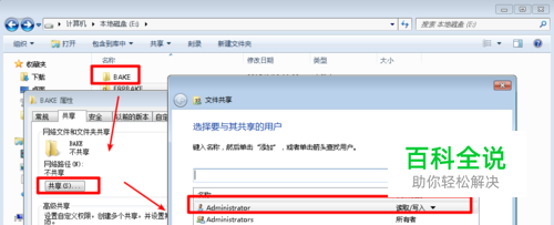 在B中建立共享文件夹BAKE,并赋予administrator读/写权限或者完全控制权限