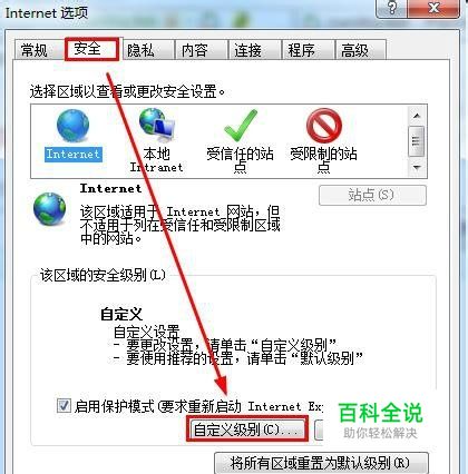在打开的“Internet选项“属性窗口中,找到“安全”选项卡下的“自定义级别”,单击进入安全设置。