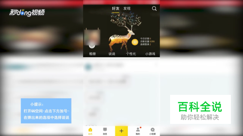 打开QQ空间,进入界面后,点击下方加号按钮,然后在弹出来的选项中,选择说说,点击进入。