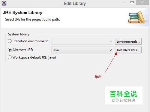 单击OK,返回到Edit Library中,在Alternate JRE更改后面的列表框,随便选哪个,然后Finish,然后OK。即可解决!