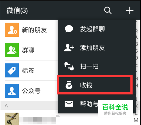 首先打开微信,然后点击【+】按钮,找到【收钱】,如图所示: