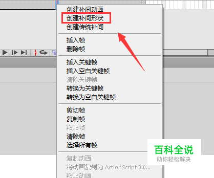 再在这两个关键帧处点击鼠标右键在弹出的右键菜单里找到创建补间形状选项,如图所示: