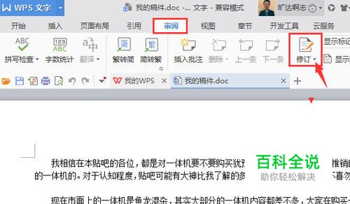 我们在菜单档中找到并单击“审阅”菜单,在下面的命令中单击“修订”命令。