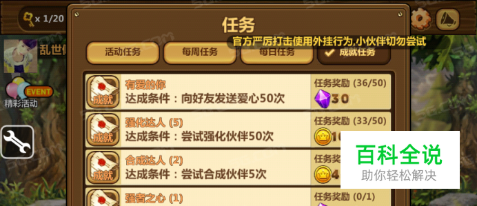全民打怪兽金币是可以通过花费钻石购买的,那如何在不花费钻石购买的情况下快速的赚取大量金币呢?并完成伙伴强化任务呢?想知道的一起来看看吧! 【成就任务】 成就任务可以说是平常玩家接触最多的任务,也是覆盖范围最广的一类。成就任务一共包含23项小任务,分为新手操作类,冒险闯关类,强化合成类、伙伴收集类、好友送心类以及大战模式类这六种。建议玩家们可以按照成就任务的指引进行游戏,既可以提高实力又能获得奖励,简直实惠有木有! 【每日任务】 系统每天都会为玩家准备三个简单的每日任务,相当于参与就有奖的类型。所以小编建议玩家,上线先看一遍每日任务,在游戏过程中就能合理安排玩游戏的节奏了。而这几项任务奖励的金币并不多,由于程度不难,所以可以顺带完成就好。 【每周任务】 顾名思义,就是每周刷新一次的任务。这类任务的难度和奖励都处在每日任务和成就任务之间。建议玩家在每周最后一两天关注一下,临门一脚,不要白不要,默言只能教你们到这里了! 【活动任务】 这一类任务主要是指系统定期推出的一些优惠活动,特点是奖励力度大。当然,这类划算的任务也是需要玩家进行小小投资的,比如充值送小伙伴等,玩家可以根据奖励内容选择合适的活动任务完成,小投资大回报,偶尔做一次土豪的感觉就是那么自信!