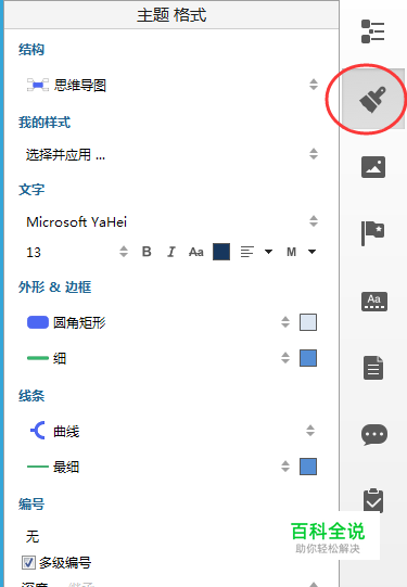 下面,小编将针对主题格式视图中的元素,介绍在主题视图中,可以对主题进行哪些具体的设置。首先,我们在XMind 8中选中一个思维导图中的某个主题,然后点击侧边工具栏中的格式图标,以打开主题格式。