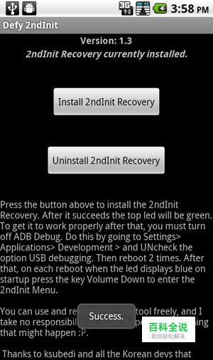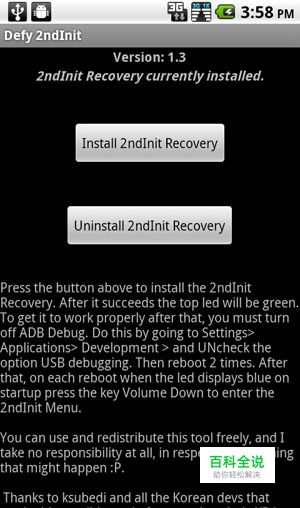 如果你的手机之前已经 ROOT ,请安装附件中的 recovery.apk 程序。安装完成后运行软件,点击 install 2ndinit recovery 安装 recovery ,中间会请求2次 权限,全部允许!