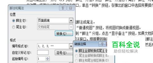将文档中所有注释转换成脚注或尾注。 点击功能区的“引用”项,找到“脚注”分组,点击“脚注”分组右下角的“脚注”对话框启动器,将弹出“脚注和尾注”窗口,单击“转换”按钮,在弹出的窗口中选择所要操作的选项,按“确定”按钮转换即可