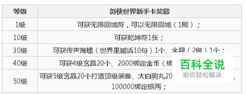 具体奖励内容如下: 等级 剑侠世界新手卡奖励 1级 可获无限回城符,可以无限回城(1周); 10级 可获乾坤符1张; 30级 可获传声海螺(世界里喊话10句)1个、金犀(2级)1个; 40级 可获4级玄晶20个、2000绑定金币(绑金用处很大); 50级 可获5级玄晶20个打造顶级装备、大白驹丸20个可以下线领取经验、100000绑定银两; 60级 可获6级玄晶10个价值不菲、200000绑定银两; 69级、可获7级玄晶10个价值不菲、300000绑定银两、5000绑定金币 69级 可获7级玄晶10个价值不菲、300000绑定银两、5000绑定金币;