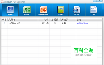 1,PDF转WORD,PPT,EXCEL,TXT,HTML,EPUB的方法方法1:软件anybizsoft PDF Converter可实现从PDF到(WORD,PPT,EXCEL,TXT,HTML,EPUB)的单向转换操作:打开软件anybizsoft PDF Converter→添加(待转化的文件)→选择WORD(或你要转化的格式)→开始转换→完成