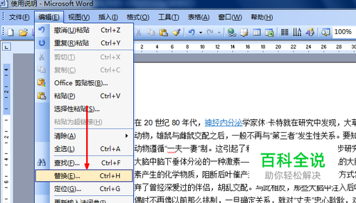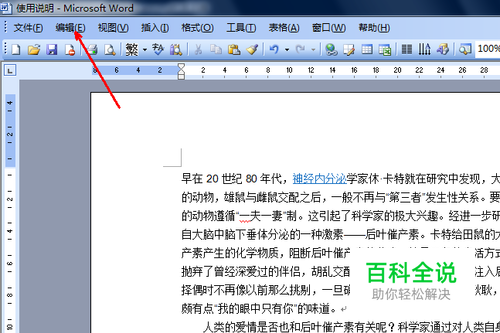 首先打开word软件,我在这里随便打开一篇文章作为演示。如图所示。如果我们想在这篇文章当中替换某个字或者词,我们就点击上方菜单栏中的编辑选项。
