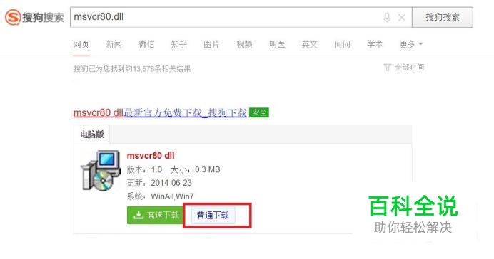 首先,我们使用搜索引擎搜索“msvcr80.dll”关键字,并在搜索结果页面中下载丢失的该文件。