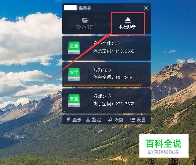 当我们遇到移动存储设备无法正常安全弹出时,可以利用一些安全类软件来处理,点击桌面上的移动存储设备图标中的“拔出U盘”菜单。
