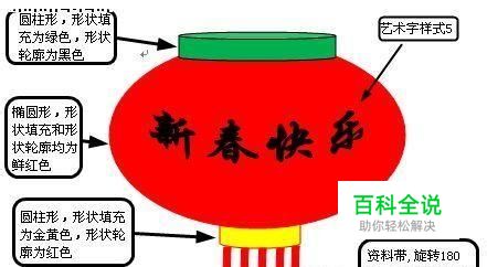 大红灯笼高高挂 依次点击“插入→形状”插入大小适宜的椭圆、两个圆柱形以及流程图中的“资料带”图形,并把资料带旋转180度,且复制多个;然后再依次点击“插入→艺术字→艺术字样式5”,输入“新春快乐”,设置好字体和字号(字号大小与椭圆大小相适应),并右击它,从右键菜单中选取“设置艺术字格式”,把版式设为“浮于文字上方型”,再移到椭圆正中央。最后把各个部分组合起来即可(如图2)。 图:红灯笼
