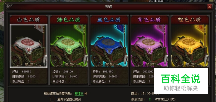 在9377皇图网页游戏里,铜钱的紧缺是每位玩家都会遇到的,为了帮助大家能快速赚钱更多铜钱,系统推出了押送镖车的玩法,玩家能顺利将镖车押往目的地,将获得丰厚的铜钱奖励。那皇图押送镖车在哪里领取呢? 当玩家等级到达60级后,玩家需要在本国王城NPC郑镖头处接取押镖任务,运往本国关隘梁镖头处,成功押送镖车可获得大量经验以及铜钱奖励,是获得大量铜钱的不二之选,每个玩家每天只能押送2次镖车,VIP玩家可额外增加1次。 皇图镖车的品质分为5种,橙色紫色蓝色绿色白色,品质越高奖励越高,玩家可以通过刷新品质来获得的镖车,玩家可以使用一建橙色功能直接获得橙色镖车。 每天国运双倍经验奖励,开启时间为每天16:30—1830,玩家在刺探双倍活动期间,完成任务可以获得双倍的经验奖励。 皇图运镖奖励虽好,风险也高。虽然镖车很坚固,每辆都有100万血量,但是运镖过程中,仍然可能发生敌国成员来劫镖情况。镖车被破坏,即会变成“破 碎的镖车”,会掉落“珍贵的货物”——拾取使用能获得铜钱。镖车被破坏后,仍旧可以继续护送完成任务,但是奖励会相应减少。 如果在运镖途中,走得太快导致跟镖车失散,不用担心,使用“传送”功能则能瞬间回到镖车旁边;如果被敌人劫镖,可以使用“求援”向家族成员求救帮助,合力将敌人击退。