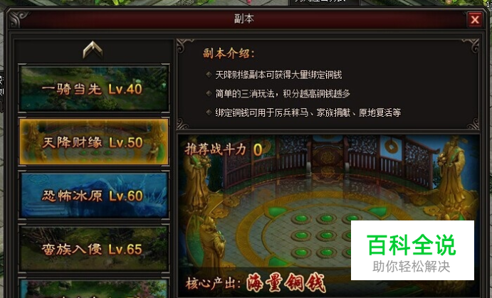 在9377皇图游戏里,很多地方都需要用到铜钱,没钱可以说对玩家来说寸步难行。而皇图天降财源副本是免费获得海量铜钱的好去处。皇图天降财源副本介绍: 等级要求:50级; 挑战次数:每天可进入2次。 副本时间:5分钟; 副本说明: 1.天降财源副本可获得大量绑定铜钱; 2.简单的三消玩法,积分越高铜钱越多; 3.绑定铜钱可用于厉兵秣马、家族捐献、原地复活等; 4.副本不分难度,副本为三消玩法,连击越高,获得的积分越多,所获得的铜钱奖励越多。