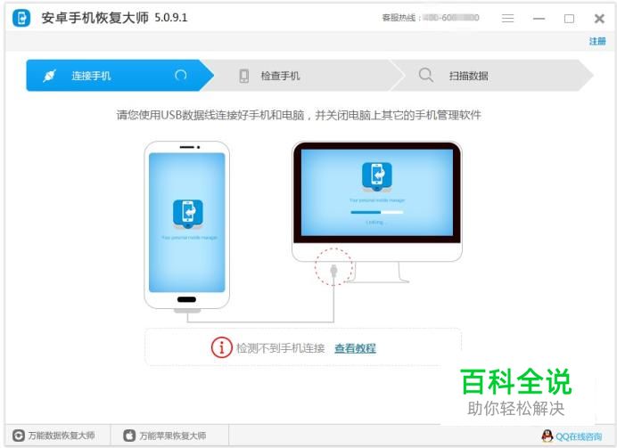 需要root手机,软件才可以连接成功,建议使用一键root工具,完成root。