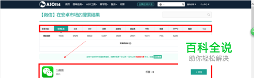 进入大数据分析平台ASO114,然后选择安卓市场,输入关键词“微信”后直接回车
