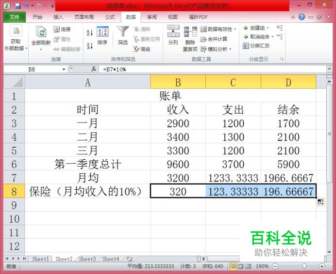 乘法: 在B8单元格中输入函数“=B7*10%"
