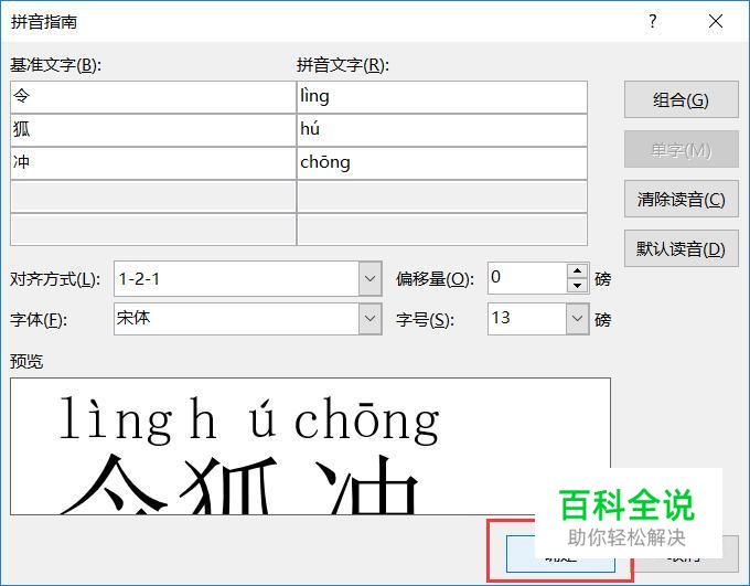 接下来,将弹出拼音添加页面,如果确认拼音无误的话,点击“确定”按钮即可。