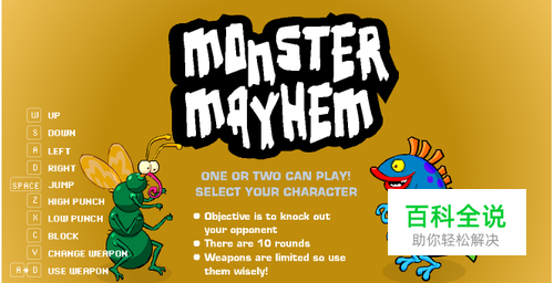 两只小怪兽一言不合便展开了一场决斗,动作场面很可爱,既可以人机对战也可以双人对决。一起来挑战一下吧!游戏加载完毕点击右侧的HUMAN选择玩家1(左侧HUMAN为玩家2,COMPUTER是电脑) - 然后点击PLAY即可开始游戏,玩家1:键盘WASD键控制移动,Z重击,X轻击,C防御,V切换武器,AD同时按使用武器,空格键跳跃。玩家2:方向键↑↓←→控制移动,N重击,M轻击,K防御,L切换武器,←→键同时按使用武器,Enter键跳跃。控制你的角色成功地击败所有的对手吧!