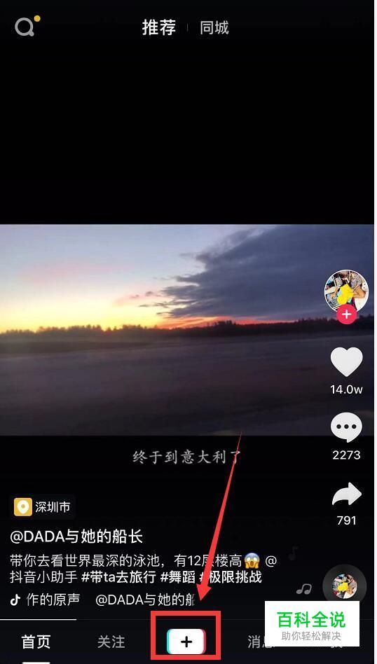 打开抖音APP,点击中间的加号“+”。