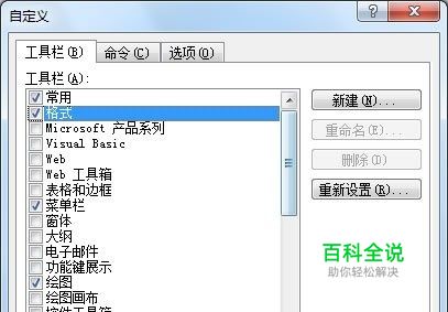 方法一、鼠标右键单击“菜单栏”或“工具栏”任意处,在弹出的下拉菜单中选择“自定义”,弹出的“自定义”-->然后“工具栏”,在这里面你可以看到里面有“工具栏”上所有的菜单,钩上然后确定即可(你也可以选择“重新设置”,选择“Normal.dot”然后确定)。