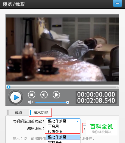 添加完成以后,会出现一个预览/截取的操作框,这就是今天制作慢镜头的重点啦,选择“魔术功能”下拉菜单,会有一个慢动作效果,选定,然后对“减速速率”做一个设置,这里以个人为准,小编我设置为2.16. 然后点击确定。