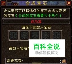 进入合成宝石界面,玩家放入3-5颗同级别同种类的宝石和1张低级宝石合成符(用于增加合成4级及以下宝石的成功率)或1张高级宝石合成符(增加合成5级及以上宝石的成功率),放入3颗宝石和1张合成符时的合成成功率为50%,放入4颗宝石和1张合成符时的合成成功率为75%,放入5颗宝石和1张合成符时的合成成功率为100%。