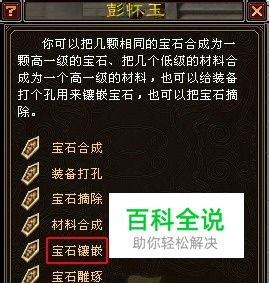 【宝石镶嵌】 必备材料:带空孔的装备、宝石、低级/高级宝石镶嵌符、极率之珠 宝石镶嵌:宝石可以镶嵌到装备上帮助提升装备属性。宝石镶嵌条件:如果装备上没有孔,则无法镶嵌宝石。不同的种类的宝石要镶嵌在不同的装备上。同一件装备上同类型的宝石只能镶嵌一个。没有宝石镶嵌符会导致镶嵌的成功率大幅下降,同时会导致镶嵌失败之后宝石消失。而加入极率之珠会防止宝石碎裂,但会降低一级宝石等级!使用高级宝石镶嵌符镶嵌宝石的时候成功率为100%,不需要极率之珠。