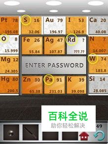 第四十九关,电梯门上乍一看全是元素周期表中的符号,门正中央写着“Enter Password”,其实这个非常简单,你只需要点击格子,使字母连接后组成单词“Password”就可以打开电梯门了。