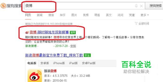 首先,我们需要先进入微博的官网,如图所示,用浏览器搜索“微博”即可找到网址。